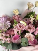 Lilyum, Lisianthus, Aslanağzı, Ekvator Gülü ve Okaleptus ile hazırlanmıştır.