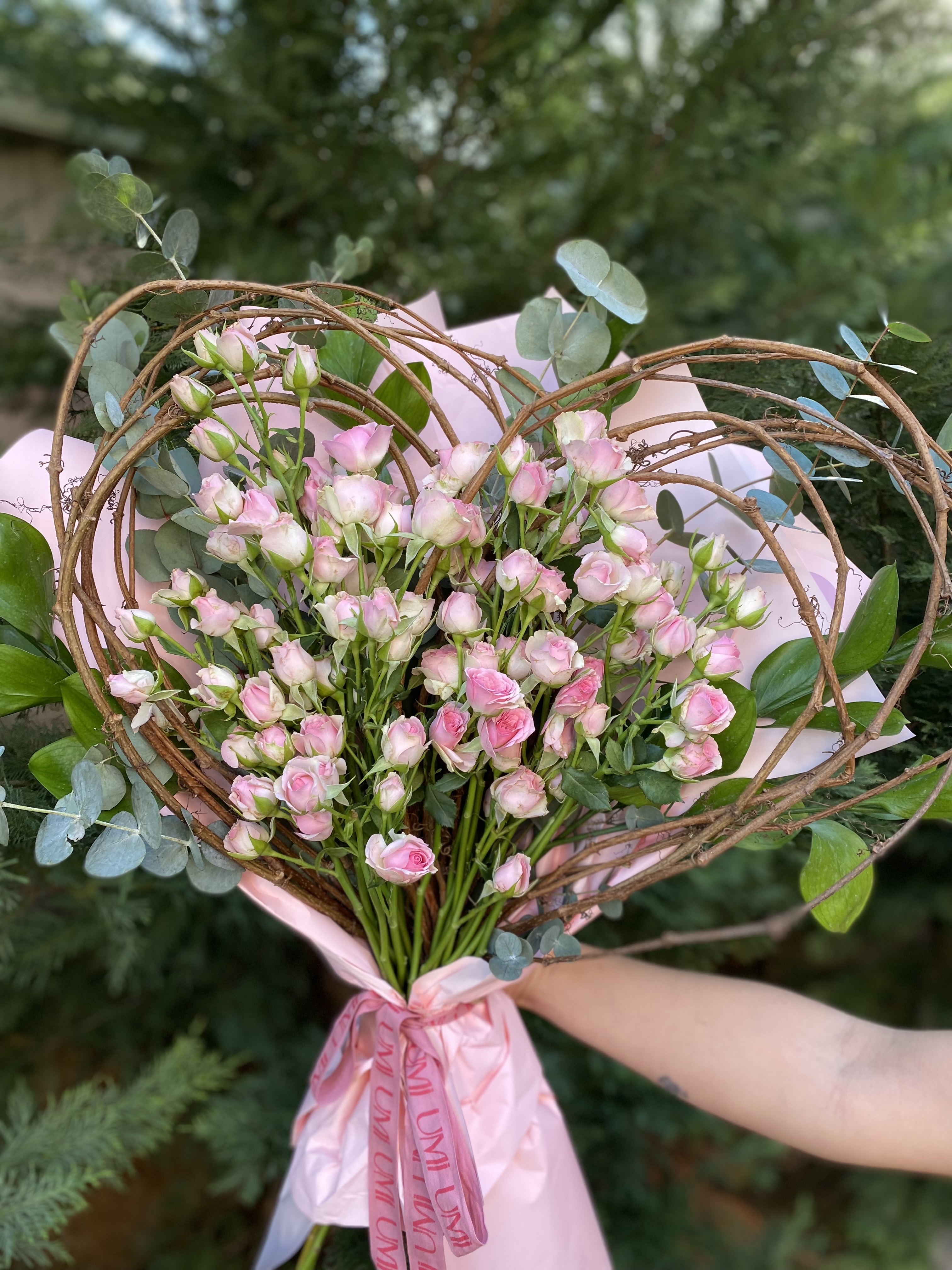 • Malzemeler: Pink Dream Kalpli Sprey Gül Buketimizde 20 adet pembe sprey gül, ruskos, okaliptus ve dallardan yapılmış bir adet büyük boy kalp kullanılmaktadır.