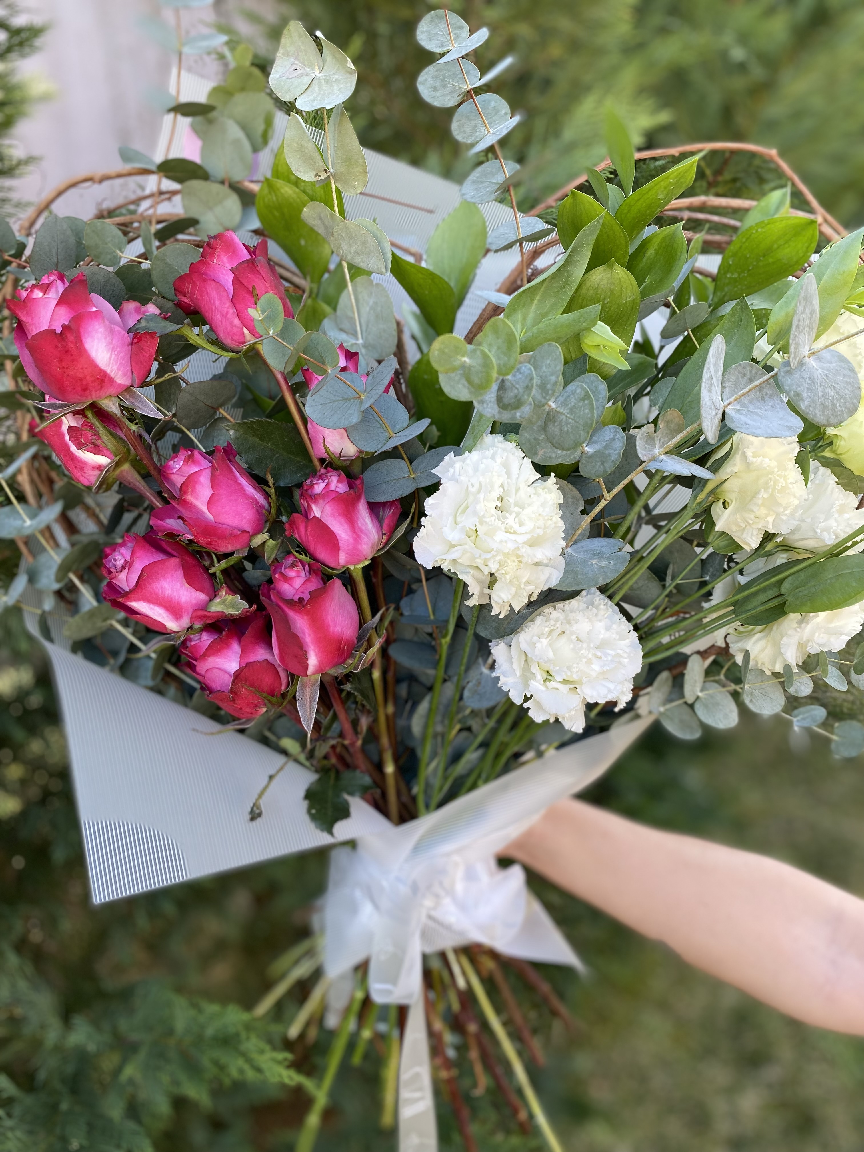 • Malzemeler: Tender Kiss buketimizde 9 adet ithal gül, 9 adet lisyantus, okaliptus, ruskos, ve dallardan yapılmış bir kalp bulunmaktadır.